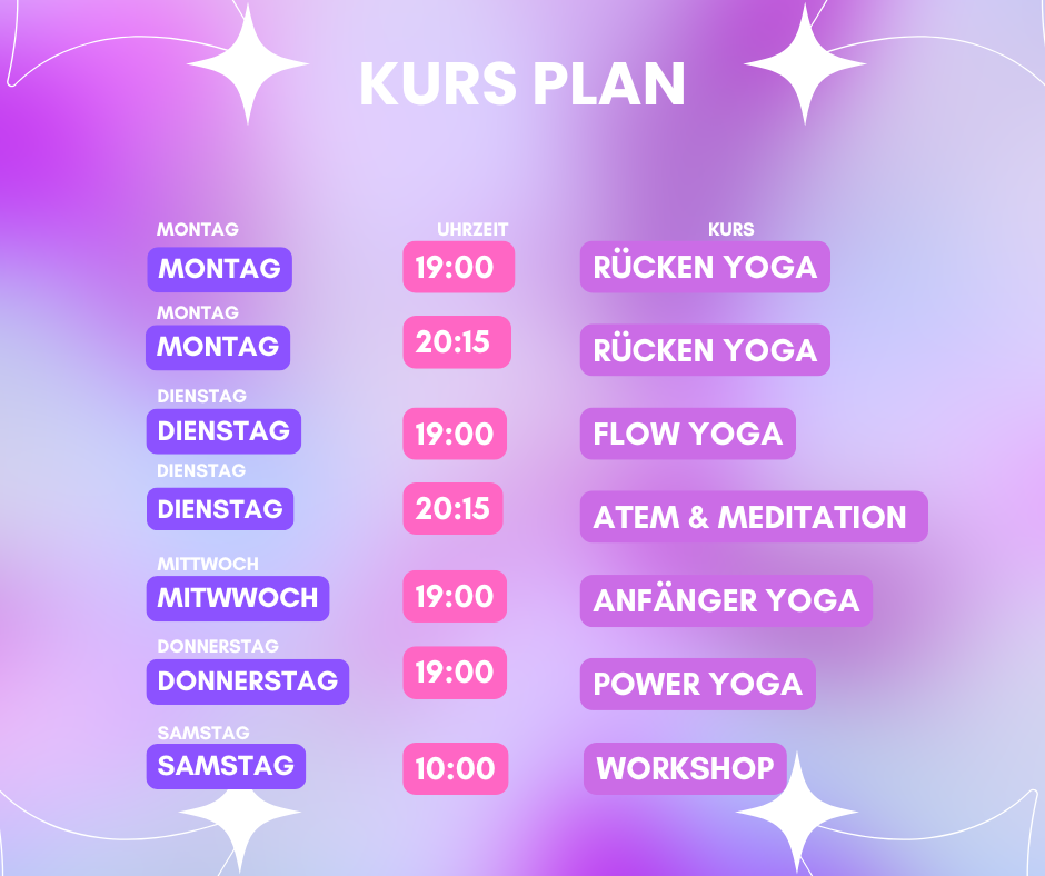 Montags lenken wir den Fokus auf RückenYoga. Entdecke die wohltuende Wirkung von Yoga auf deinen Rücken! In diesem 10-wöchigen Kurs lernst du gezielte Übungen zur Kräftigung, Dehnung und Entspannung deiner Rücken- und Rumpfmuskulatur. Der Kurs ist ideal für Anfänger – ganz ohne Vorkenntnisse.